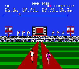 What I do want to talk about is how badly this game translates what it is trying to simulate into gaming form. I love running. I love Track and Field. I love the idea of video games that try to simulate the fun and thrill of racing . Stadium Events fails hard because it takes an incredibly lazy approach to solving the racing problem. The Family Fun Fitness Pad (later Power Pad) is required to play this game. The incorporation of that is simple: Run in place, run in the game. Jump in the air, jump in the game.